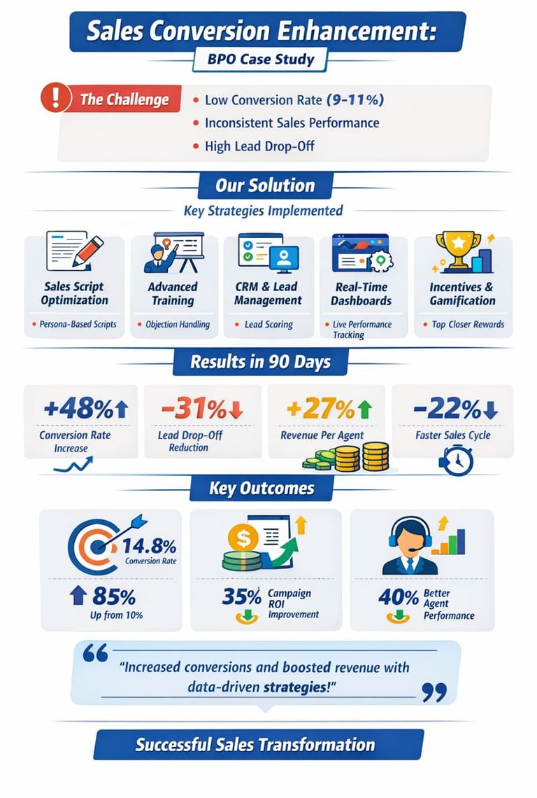 Low sales conversion rates due to ineffective scripts, inconsistent agent performance, and poor follow-up on qualified leads—resulting in lost revenue and low campaign ROI.